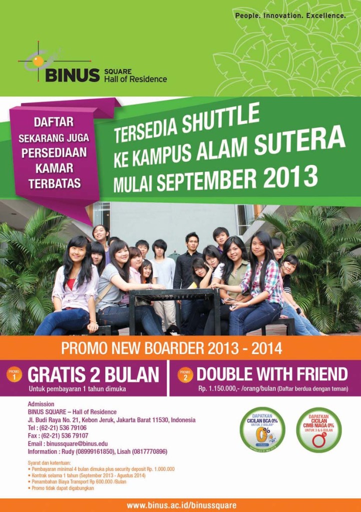 Are you BINUSIAN at Alam Sutera Campus and looking for accomodation, BINUS SQUARE provides shuttle to Alam Sutera start from September 2013. Register to BINUS SQUARE now and grab the promo. Limited room!!!